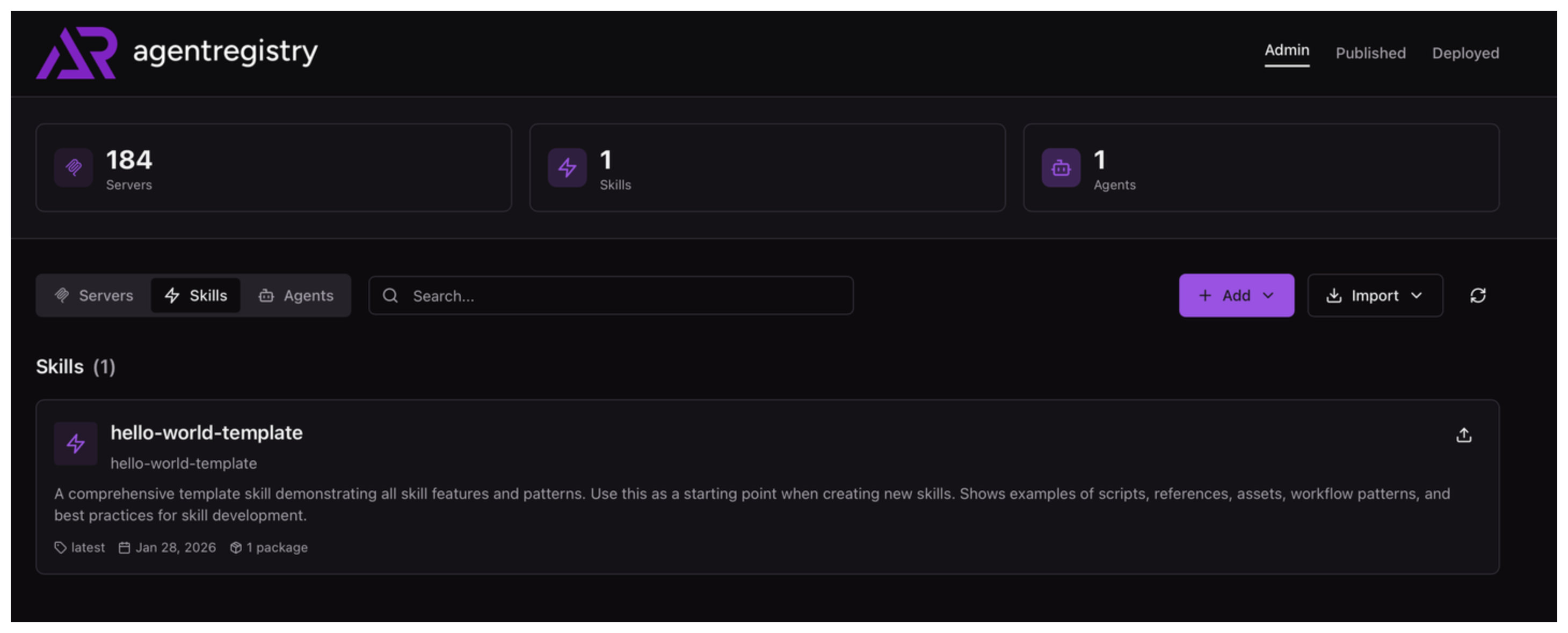 Agentregistry serves as a catalog for your AI artifacts, including agents, skills, and MCP servers. To control which images you want to make available to your teams, you can use the publishing capability in agentregistry. If a skill is published, a reference to its source (container image or GitHub repository) is stored in agentregistry. This allows teams to quickly discover approved skills and pull them from the registry.